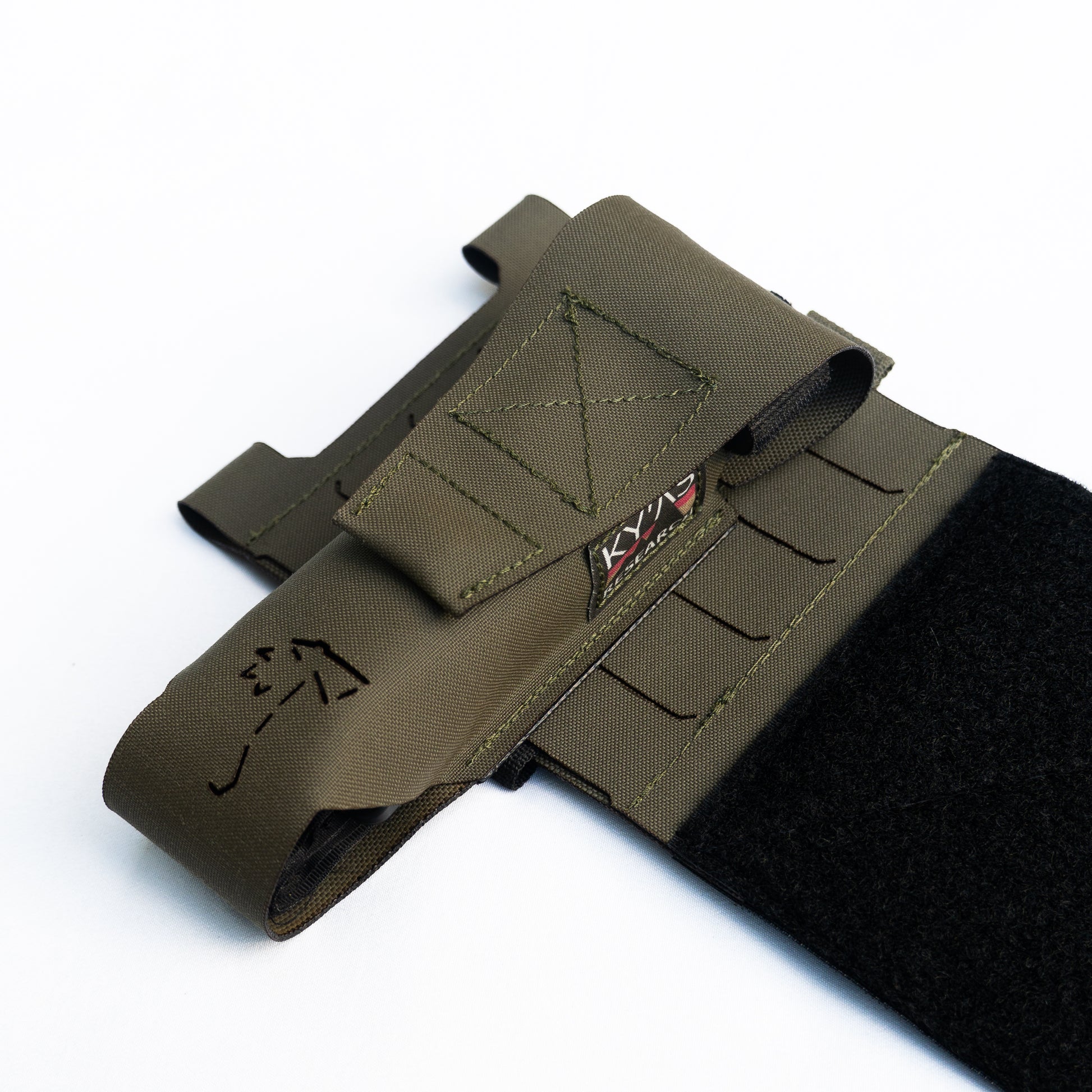 This pouch is a 2 piece system, with a main pouch and a retention flap. The flap is attached to the tourniquet, which is then stowed into the main pouch and retained using hook and loop.